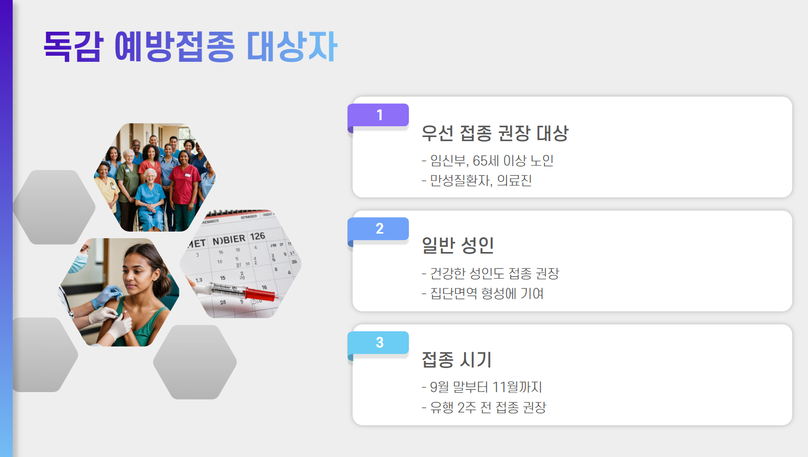 독감 백신은 9월~11월 사이에 접종하는 것이 가장 효과적이며, 특히어린이, 노약자, 임산부는 반드시 예방접종을 챙기셔야 합니다!