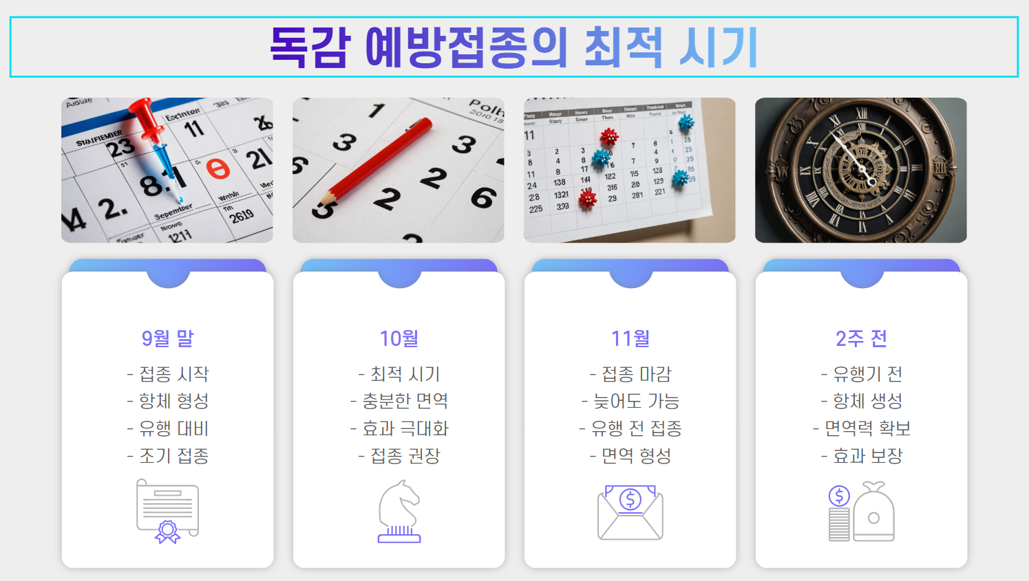 사실 독감 백신은 맞는 시기가 매우 중요합니다! 적절한 시기에 맞아야 최적의 면역 효과를 얻을 수 있기 때문이죠.