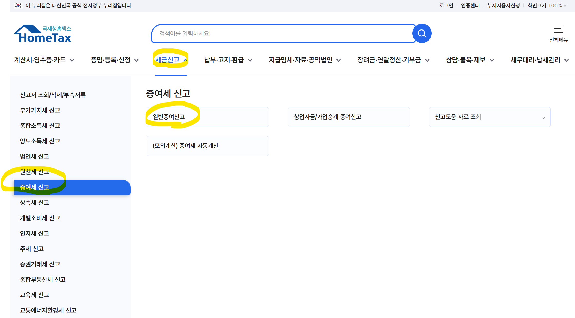 - 신고/납부 → 세금신고 → 증여세 신고 → 일반증여신고 선택