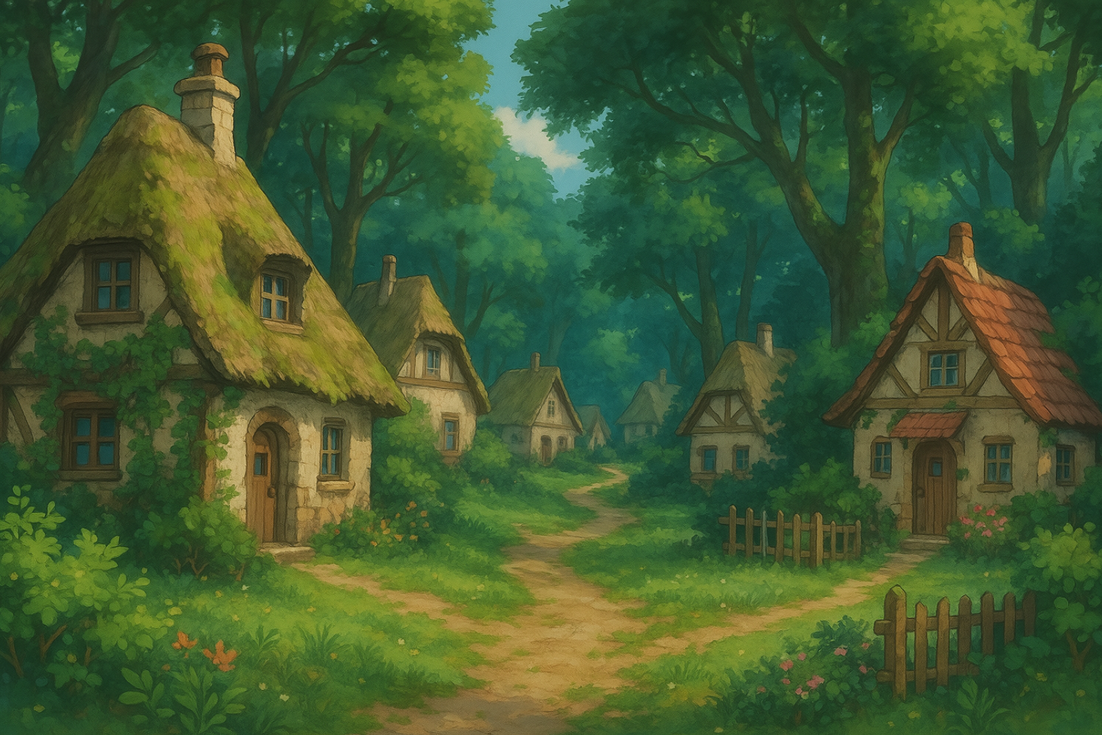 - "지브리 스타일로 그려진 숲속의 작은 마을 프롬프트 만들어줘"