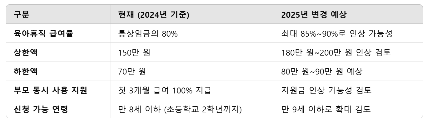 현재 육아휴직 급여는 **월 통상임금의 80%(상한 150만 원, 하한 70만 원)**이지만, 2025년부터는 지급 상한액이 높아질 예정입니다..